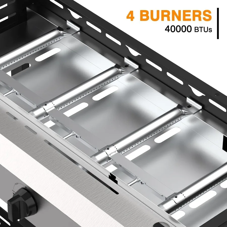 Delivering up to 40,000 BTU of heat, the four independently controlled burners create multiple cooking zones — perfect for pancakes, bacon, burgers, veggies, and more at the same time. The spacious stainless-steel cooking surface distributes heat evenly while remaining easy to clean after every meal.