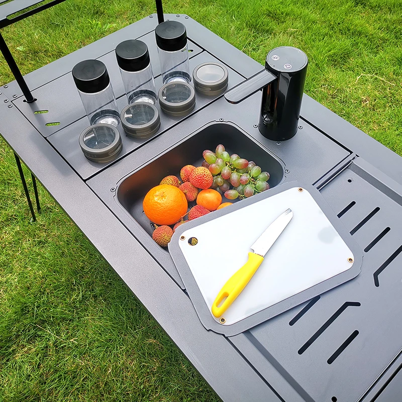 This aluminum alloy IGT camping sink system combines a wash basin, cutting board, and tea tray into one compact, modular setup — giving you everything you need to prep and clean in one place.