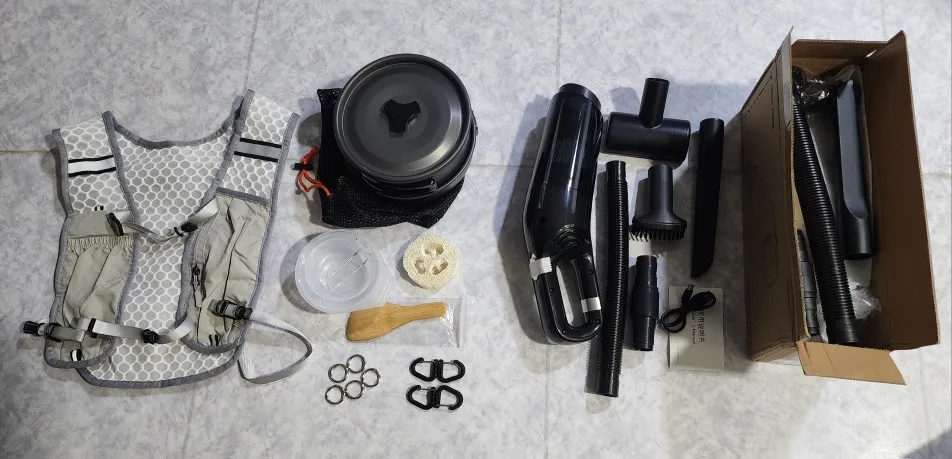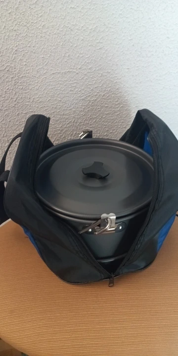 I liked the kit, I’ve already used it once. It’s excellent for trips, even large ones or with a big family, as it can hold a lot of food easily to carry due to the carrying bag. It comes with five plates, two small-sized trays for placing ready food, a ladle, a sponge, a wooden spoon, lids, and other accessories.