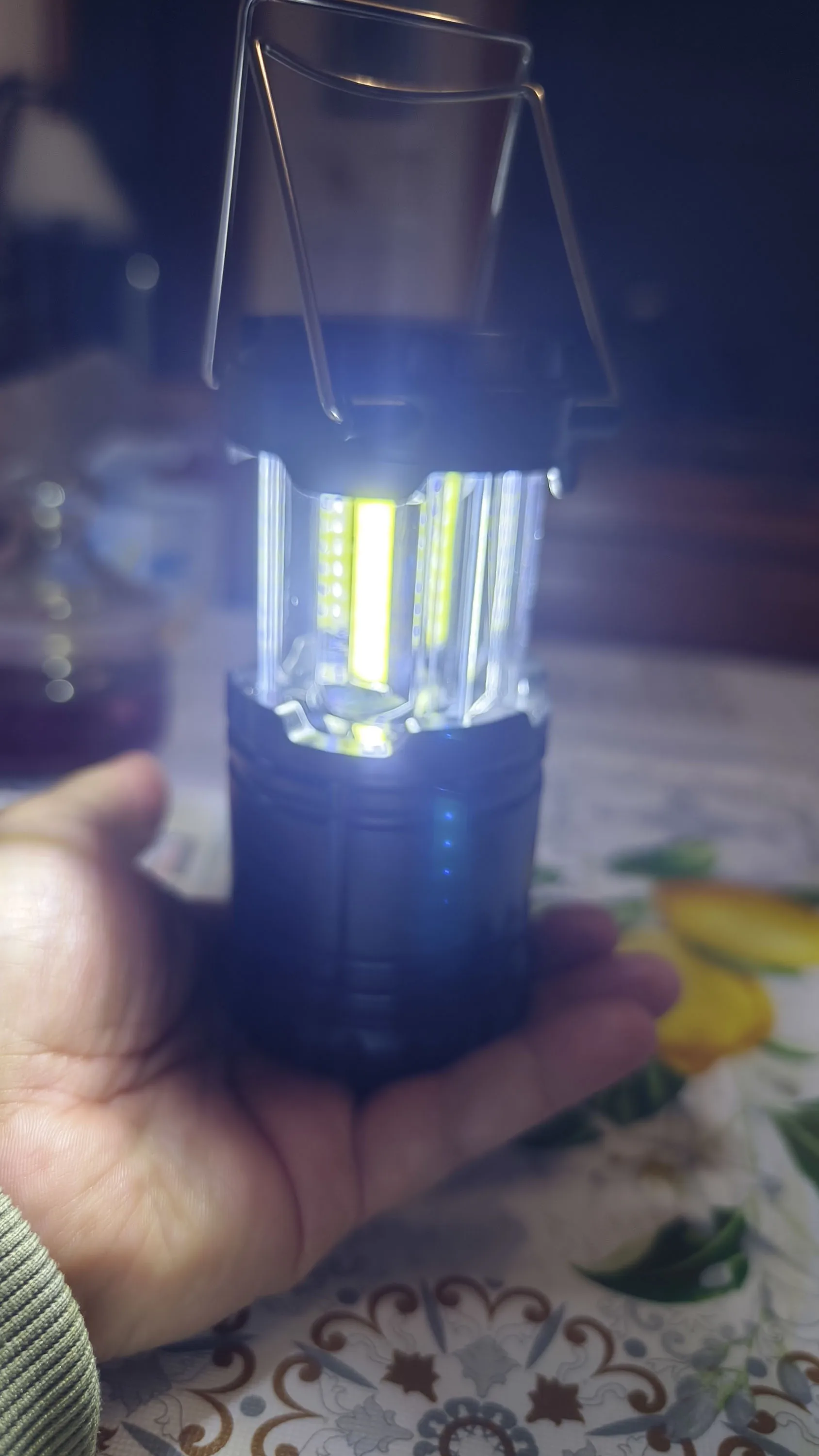 Super handy lamp for camping or power outages. Battery operated. Lots of light, you can adjust it yourself by sliding it in and out. Can also be hung.