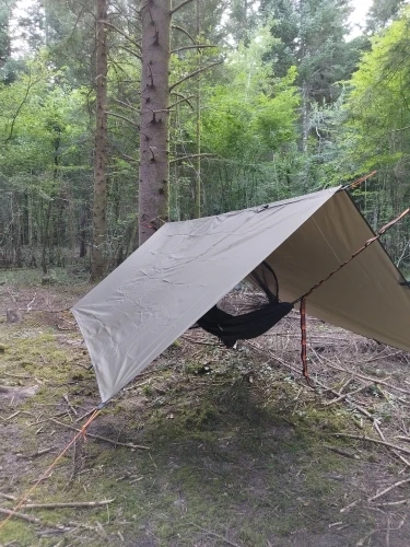 The tarp (3x3m) is about half the weight compared to the old military tarp (2x2m). It was delivered in a practical zippered package. The handles are well-made and seem durable. The inside of the tarp is covered with a reflective layer, which will certainly improve insulation properties.