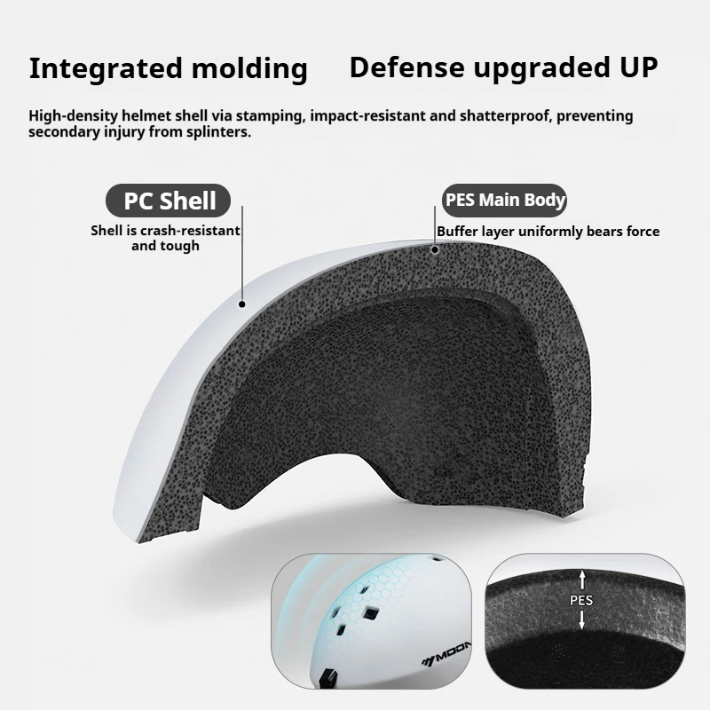 The MOON Skiing Helmet with Integrated Goggles combines a high-impact protective helmet with built-in ski goggles, eliminating the need for separate eyewear while ensuring full head and eye safety. Constructed with a durable PC outer shell and shock-absorbing EPS foam, this helmet delivers reliable protection, comfort, and convenience for active riders.