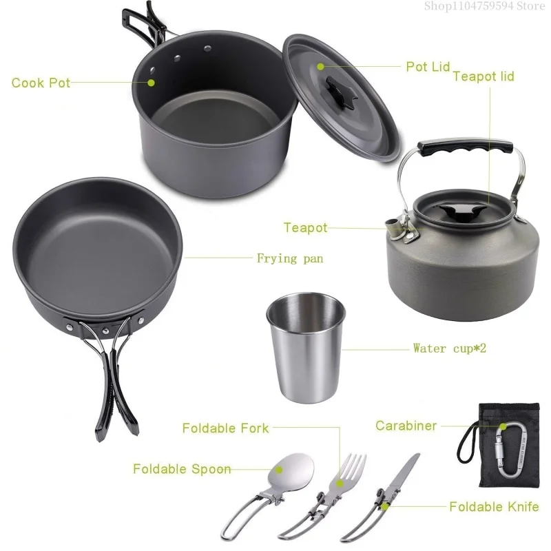 The Outdoor Cooking Equipment 2–3 Person Camping Pot Set provides a compact and efficient cooking solution for small groups. This set includes a folding pot and kettle combination, designed for outdoor use such as camping, hiking, backpacking, and picnics. Made from lightweight anodized aluminum, it distributes heat evenly and resists corrosion. The foldable handles and nesting design allow for easy storage and transport.