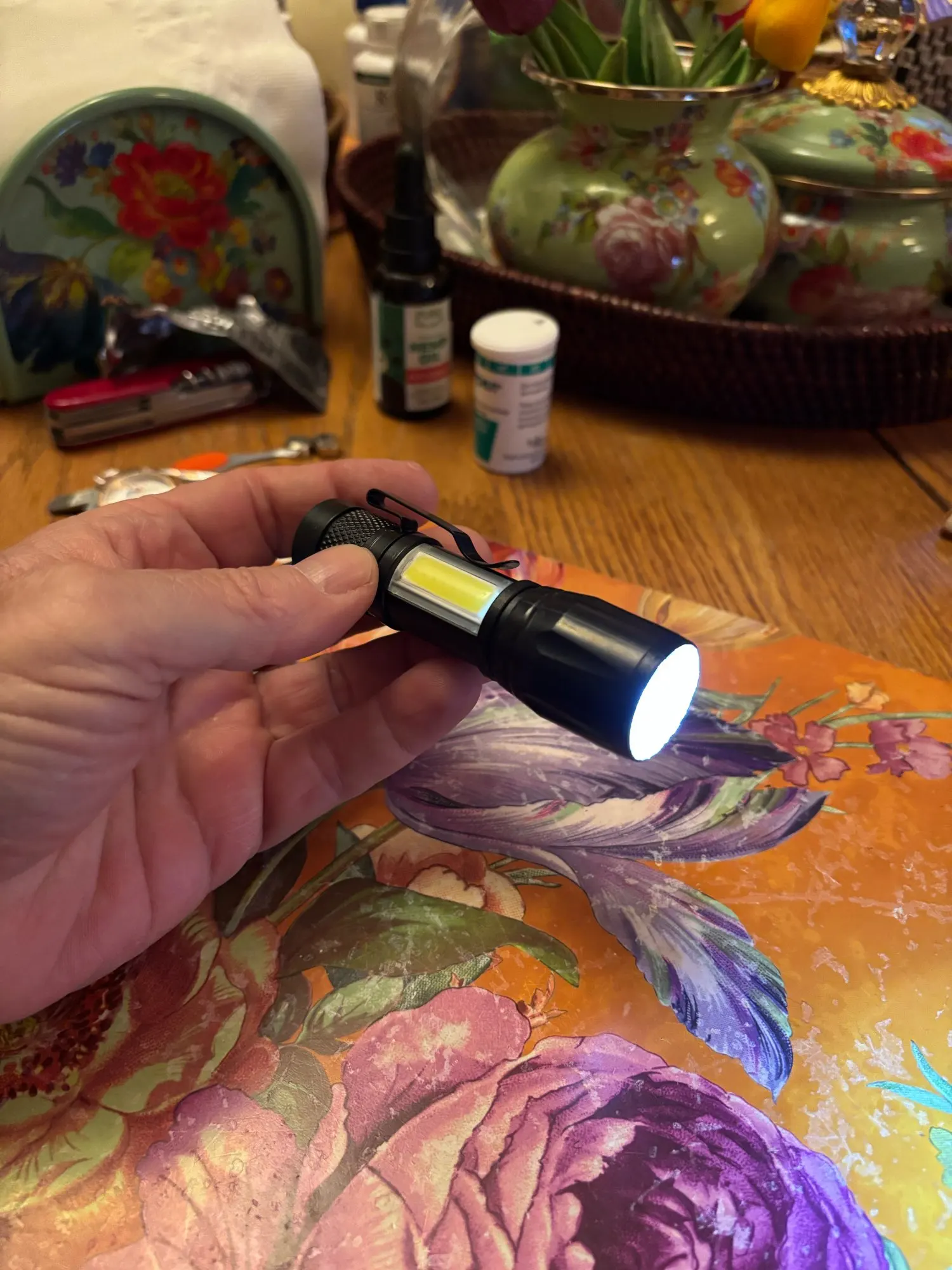 These little flashlights are really nice to have around , very bright with a side light so you can stand it up without having to hold it to see. Also has a flashing light , adjustable beam. Chargeable with a supplied cord. These are great just to have around. Get a few of them and put them in your car, or in a bag, around the house .