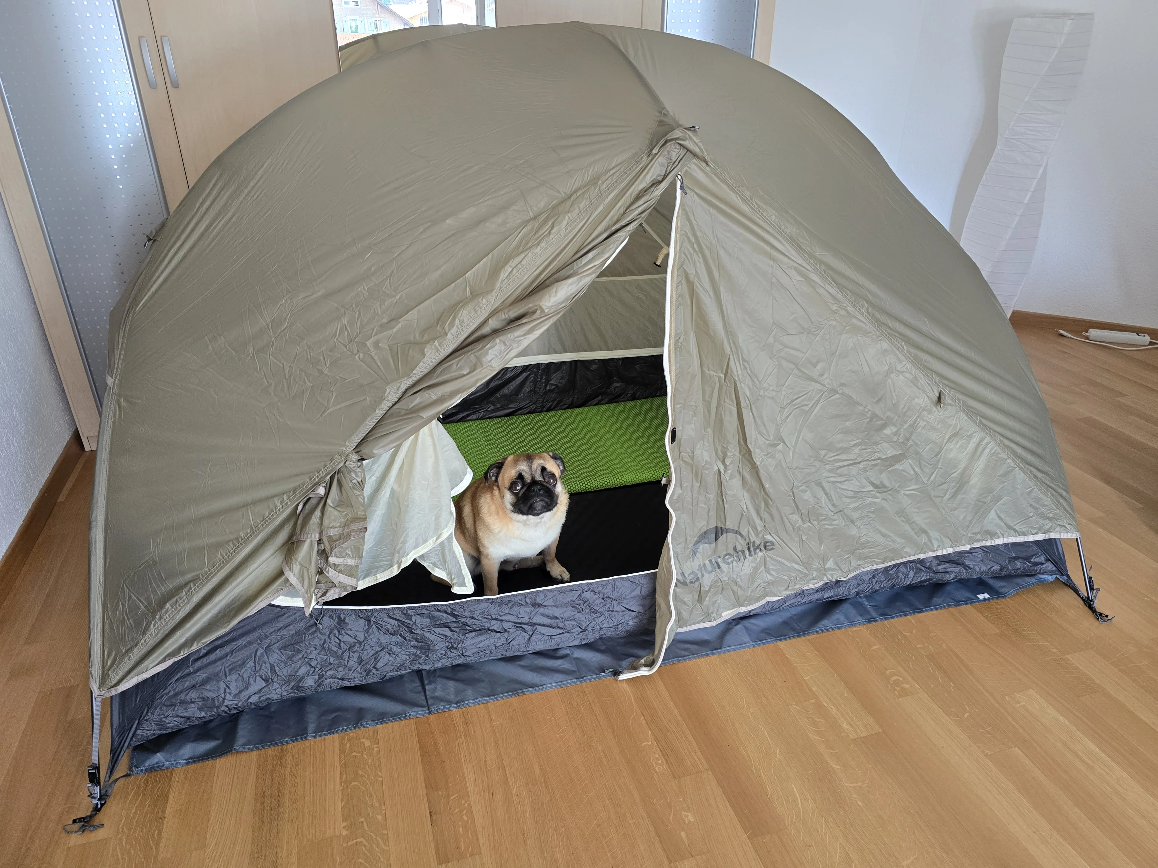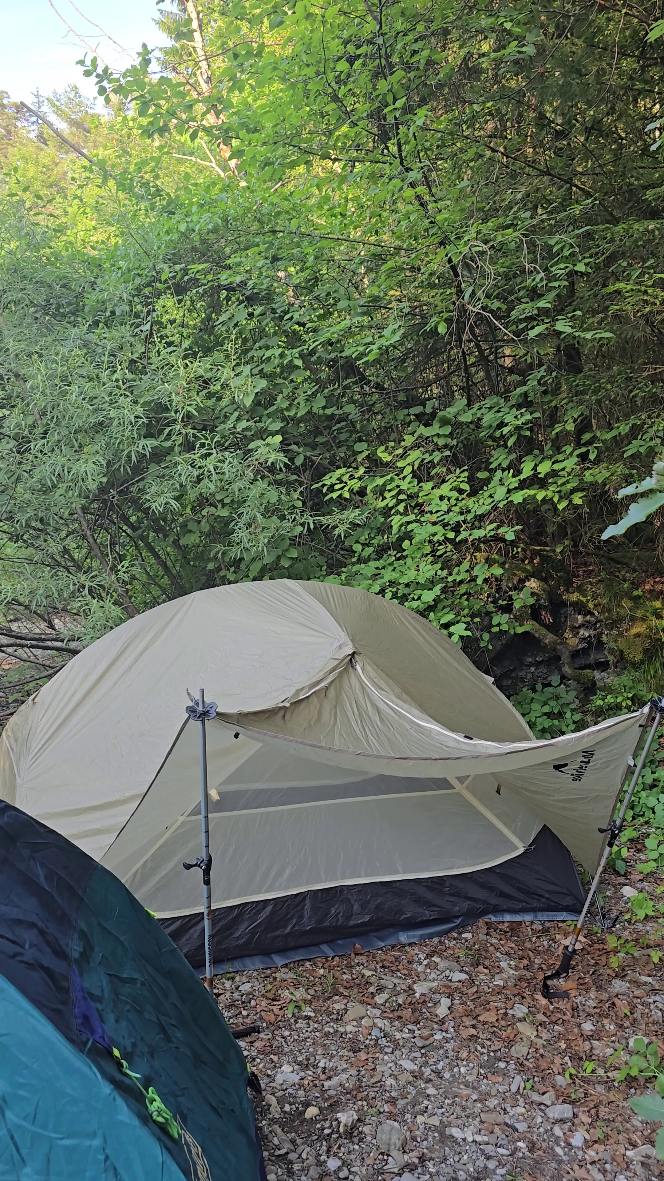Nice tent, we liked it. Not very big, but it can be doubled for sleeping. It doesn’t leak, tested in the rain, quiet. Sets up quickly. I recommend it.