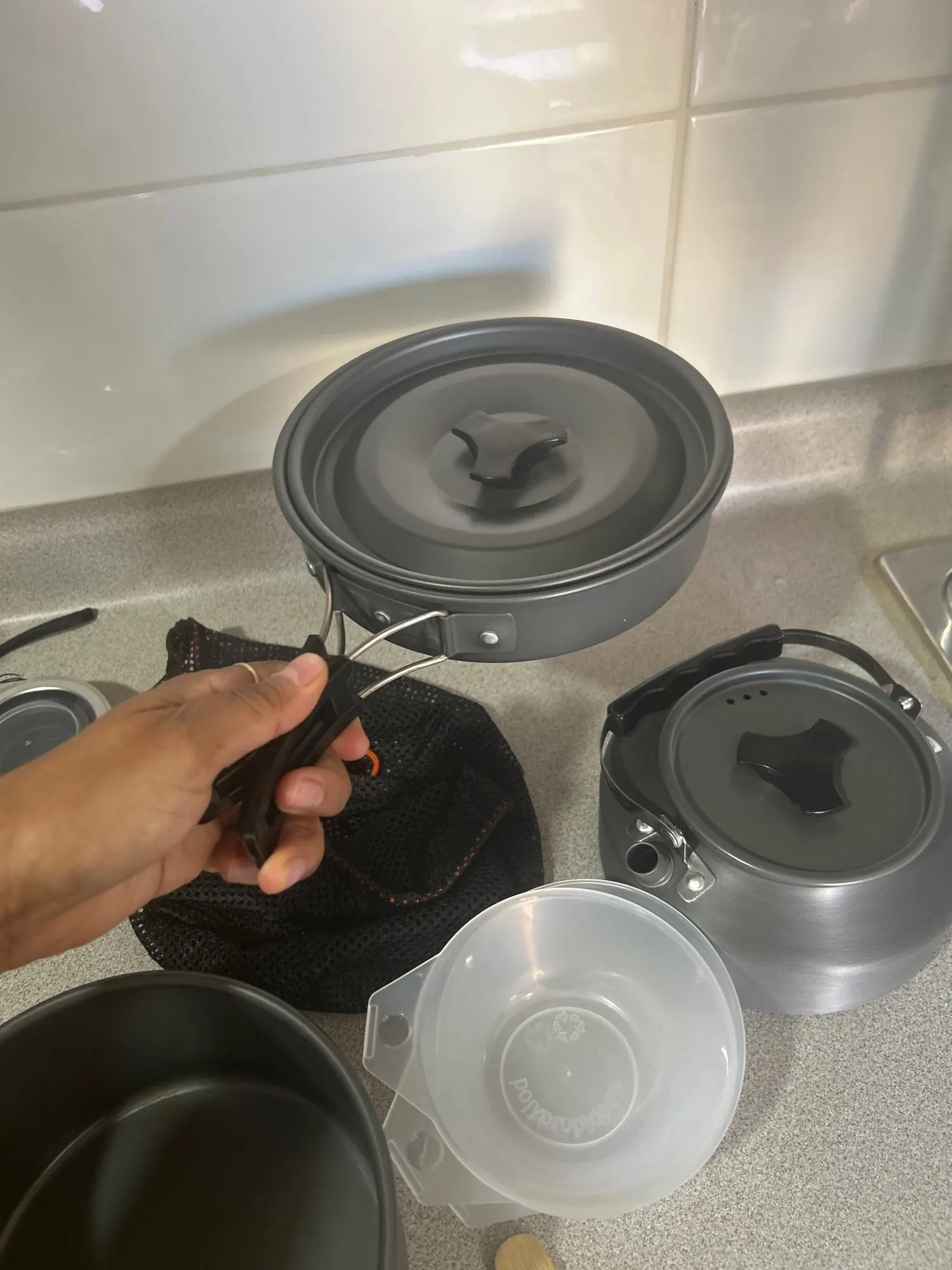 This cookware set is very compact and comes with a cloth bag for storage. It’s made of aluminum alloy with excellent craftsmanship and attention to detail. The quality is very good, and it’s lightweight and easy to carry.