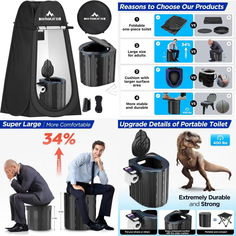 - Features: Foldable design, privacy enclosure, portable potty, multi-use setup